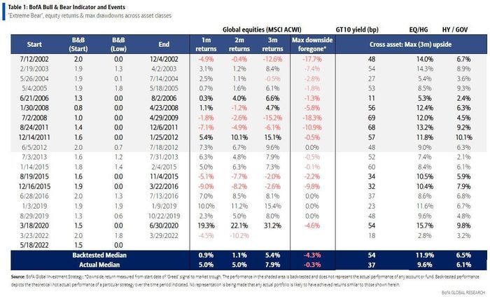 Michael Hartnett指出,该指标曾在2002年8月、2008年7月、2011年9月、2015年9月、2016年1月和2020年3月跌至0,当该指标归零时(除了2002年的“双底衰退”以及2008年和2011年的系统性事件),美股在之后的3个月的回报一直很强劲。