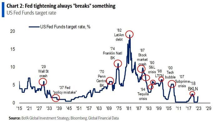 Michael Hartnett还表示,在以下三个点位,将是“逢低买入”信仰者出手的绝佳时机,“标普500指数在3600点可‘小幅买入’(nibble),3300点‘适量买入’(bite),3000点‘大胆买入’(gorge)。”此外,美银还提醒投资者称,美联储倾向于在其紧缩周期中“打破某些东西”。