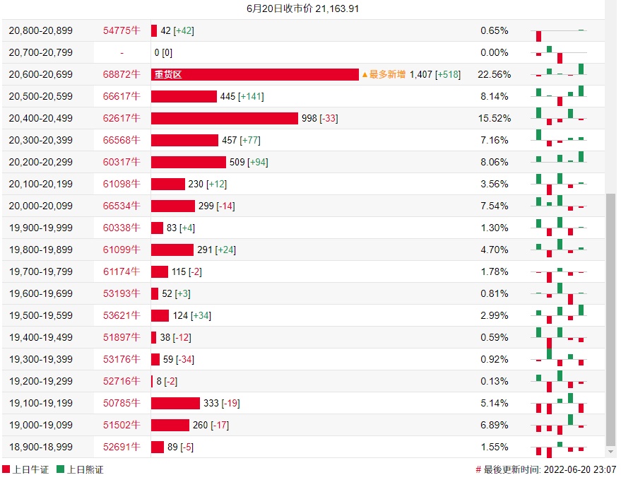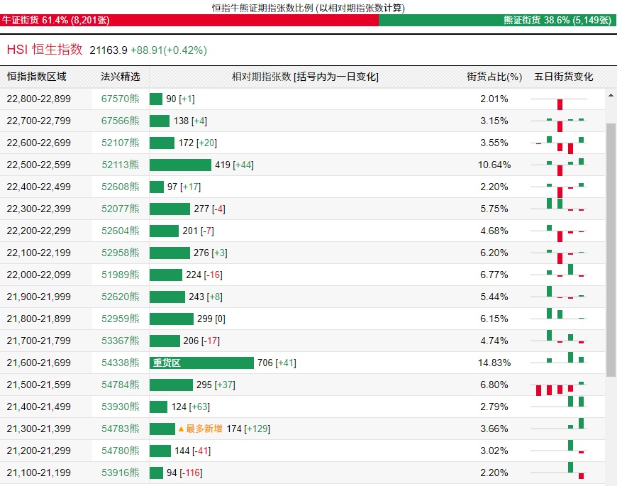法兴恒指牛熊证街货分布图中的数据显示,熊证街货重货区在21600-21699区间,该区间最新熊证数量为706张,较上一交易日增加41张;最多新增在21300-21399区间,该区间最新熊证数量为174张,较上一交易日增加129张。