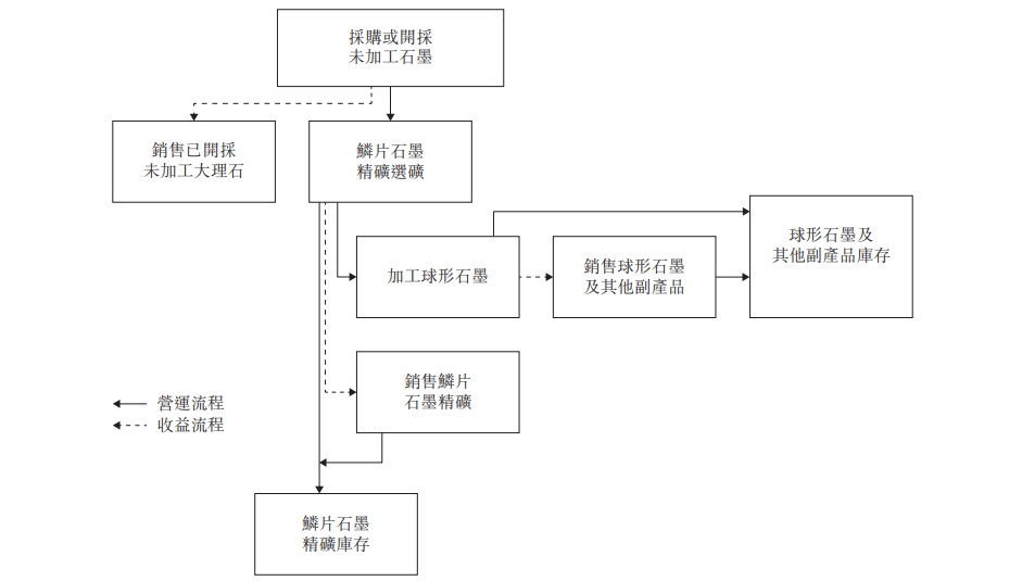 业务模式方面,公司于选矿及加工厂生产的主要产品(即鳞片石墨精矿及球形石墨)目前依赖从北山矿场开采及向第三方供应商采购的未加工石墨供应。该公司亦销售未加工大理石(开采营运的副产品)。下文所载的流程图说明石墨材料从采购及开采到选矿及加工,以至库存及销售的过程: