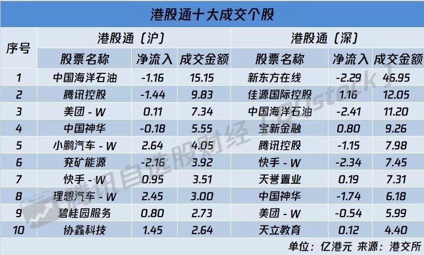 南向资金昨日净流入3.13亿港元。港股通(沪)方面,小鹏汽车-W净买入2.64亿港元,理想汽车-W净买入2.45亿港元。港股通(深)方面,佳源国际控股净买入1.16亿港元,宝新金融净买入0.80亿港元。