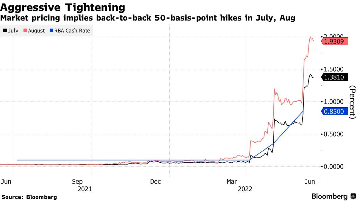 市场定价暗示澳联储7月和8月将连续加息50个基点