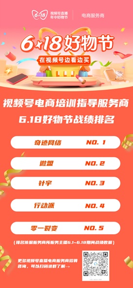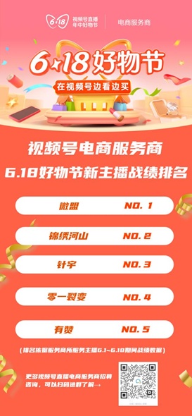 智通财经APP获悉,刚刚结束的“618”,首次“参战”的微信视频号备受瞩目。6月20日,微信视频号官方公布了最新的“微信视频号618活动服务商排行”(从6月1日到6月18日数据)。榜单显示,智慧商业服务商微盟(02013)位列视频号618电商服务商新主播榜单第一,位列视频号电商培训指导服务商榜单第二,表现十分抢眼。