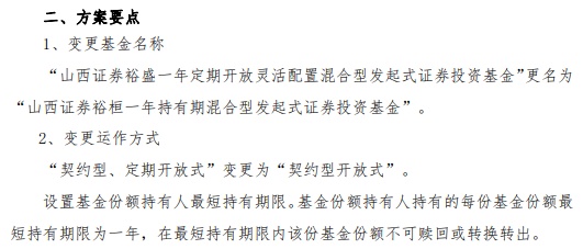 6月20日,山西证券发布公告称,为应对复杂多变的证券市场环境,更好地维护基金份额持有人利益,提高产品的市场竞争力,经与基金托管人民生银行协商一致,决定变更基金名称,将“山西证券裕盛一年定期开放灵活配置混合型发起式基金”变更为“山西证券裕桓一年持有期混合型发起式基金”。同时,将变更运作方式,从“契约型、定期开放式”变更为“契约型开放式”。