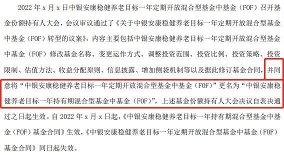 同日,中银基金也发布公告,为更好地满足基金份额持有人投资需求,提议由“中银安康稳健养老目标一年定期开放混合(FOF)”变更为“中银安康稳健养老目标一年持有期混合(FOF)”,提议基金实施转型。