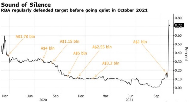 2021年11月,澳洲联储今日早些时候宣布放弃其债券收益目标,即取消2024年4月到期债券0.1%的国债收益率目标。有财经媒体认为,这在一定程度上表明澳联储、日本央行和其他各大央行在市场动能增强时维持收益率目标的难度激增。当时主要经济体通胀压力加剧,引发全球债券崩盘。澳洲联储洛威在当时的一份声明中承认,他实际上是在向市场力量低头。