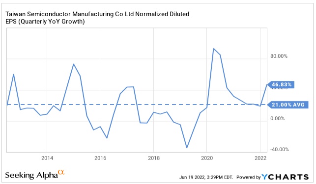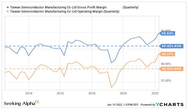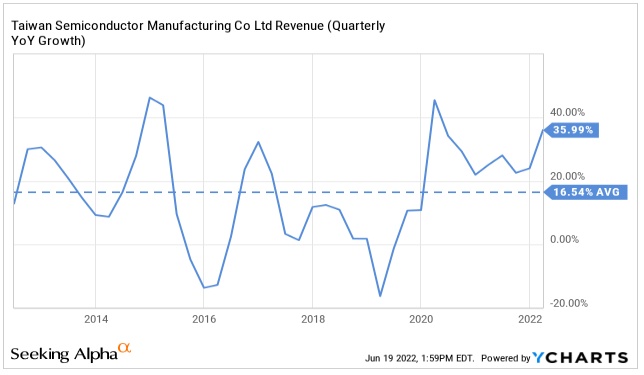 使台积电成为优势企业的另一个特点是其高增长。过去十年,该公司的营收平均增长约16%。虽然相对来讲,该公司属于周期性企业,但总体而言,其营收平均水平依然很高,甚至最近几个季度的平均水平(约为36%)都要高于长期平均水平。