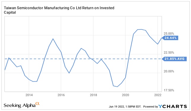 反过来,具备竞争力的护城河也为该公司带来了诱人的投资回报。例如,台积电过去十年的投入资本回报率(ROIC)平均约为21%,近期继续上升至约24%。台积电并非一家轻资产公司,因为它需要数十亿美元的投资。这使其业务更加接近于理想化,即能够吸收大量资本并仍能提供非常高的回报率。