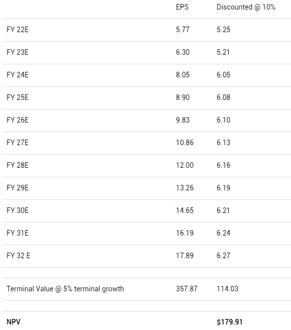另外,从折现现金流模型的计算结果也可以看到,该股被低估了。在过去十年中,该公司利润平均增长了21%。如果以保守估计,在前三年的简单折现现金流模型中使用分析师平均预期收益计算,并假设未来七年的增长率为10.5%(是公司前十年的一半),该公司最终增长率将为5%,再以10%的折现率计算,该股每股净现值将为179美元,即当前交易价格的两倍多。这表明,如果该公司能够继续实现至少一半的历史增长率,那么股价就可以说是被低估。