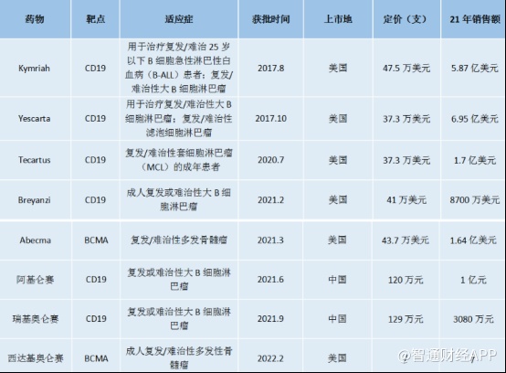 数据显示,目前全球范围内已上市的8款CAR-T疗法定价均超百万,远超传统治疗的收费标准。以2021年的销售数据为例,这些产品的销售额均未超过10亿美元。国内上市的两款CAR-T的销售额甚至低于1亿元。