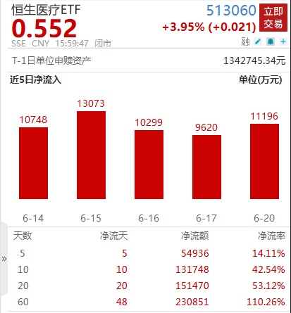 追踪该指数的恒生医疗ETF(513060.SH)收盘涨幅居前,涨近4%,今日成交总额达14.73亿,近60日内资金净流入天数达48天,净流入额超23亿,净流入率为110.26%,势头强劲!