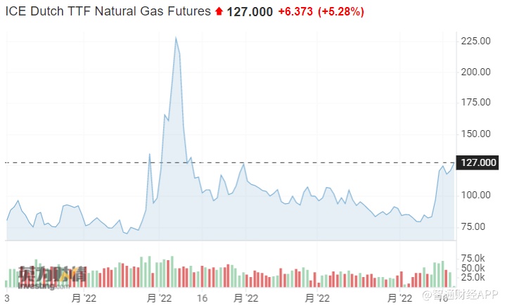 智通财经APP获悉,由于俄罗斯削减天然气供应,欧洲各国政府转向替代能源并敦促消费者减少用气量,欧洲天然气价格进一步上涨。截至发稿,欧洲基准TTF荷兰天然气期货涨5.28%,报127.00欧元/兆瓦时。该期货周一上涨2.45%,上周大涨超40%。