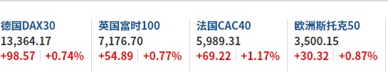 2. 截至发稿,德国DAX指数涨0.74%,英国富时100指数涨0.77%,法国CAC40指数涨1.17%,欧洲斯托克50指数涨0.87%。