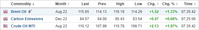 3. 截至发稿,WTI原油涨1.97%,报110.12美元/桶。布伦特原油涨1.33%,报115.65美元/桶。