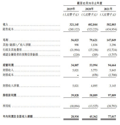 于往绩记录期间,由于公司高效的运营和优质的服务,公司实现快速增长。公司的收入以34.7%的复合年增长率从2019年的人民币3.21亿元增至2021年的人民币5.83亿元。公司的纯利以63.2%的复合年增长率从2019年的人民币2893.4万元增至2021年的人民币7701.7万元。