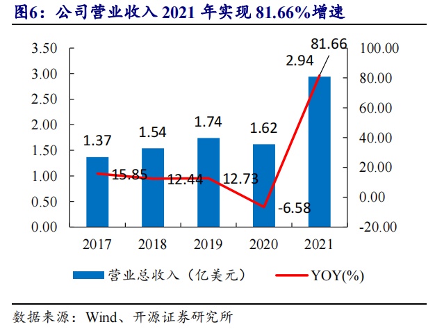 值得一提的是,2021年公司各地区的业绩实现整体上扬。其中,北美、亚太地区营业收入占比均有上升,分别由2020年的33.59%、26.52%增至2021年的38.07%、28.95%,不过其他地区占比却略有下降。开源证券表示未来北美和亚太地区的发展值得重点关注。