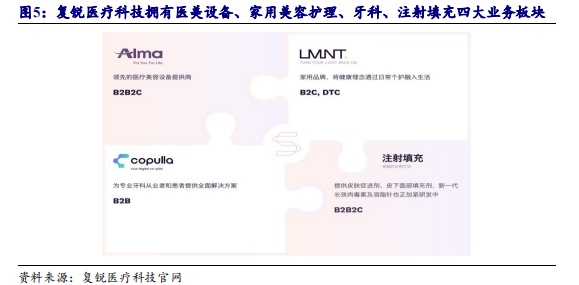 据智通财经APP了解,复锐医疗科技由复星医药控股,是复星医药医疗器械板块重要成员之一。公司深耕行业20余年,以子公司Alma Lasers为核心,以医疗美容设备为基础,是国内能量源医美设备的领军者,产品覆盖无创医疗美容、微创医疗美容和无创生活美容。此外,公司拥有注射填充类、牙科类及家用美容等三大业务线,其中 2021 年公司拓展两条新业务线——(1) Copulla,创新数字牙科服务平台;(2) LMNT,个人护理品牌,该品牌正推出基于光波能量的嫩肤家用美容仪。注射填充业务线包括皮肤促进剂、皮下面部填充剂,新一代的长效肉毒素和溶脂针目前在研发中。