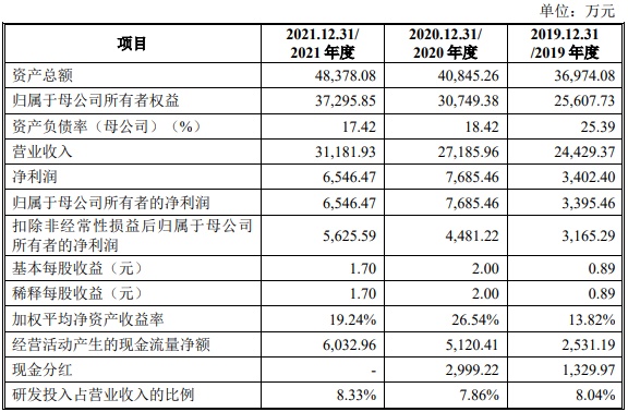 财务方面,于2019年度、2020年度及2021年度,盛帮股份营业收入分别约为2.44亿元、2.72亿元、3.12亿元人民币。公司净利润分别为3402.40万元、7685.46万元、6546.47万元人民币,归母净利润分别为3395.46万元、7685.46万元、6546.47万元人民币。2019-2021年度主营业务收入的年复合增长率为 11.90%,归母净利润的年复合增长率为 33.31%。