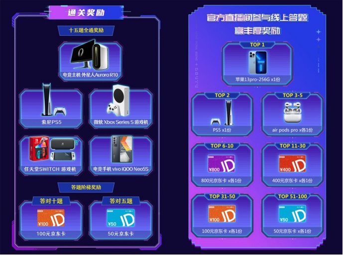 线下进阶答题模式依次分为“青铜”“白金”“史诗”3个级别,每一个阶段都有5道题目,挑战者每成功挑战一个阶段,可选择继续或放弃。挑战者如果答对15道全游戏领域的问题,便将获得“十五题全通奖励”,即电竞主机外星人AuroraR10、索尼PS5等丰富巨额奖品,实现“游戏玩家的终极梦想”,答对10道题和答对5道题的玩家也将分别获得100元、50元面值京东卡的答题进阶奖励。