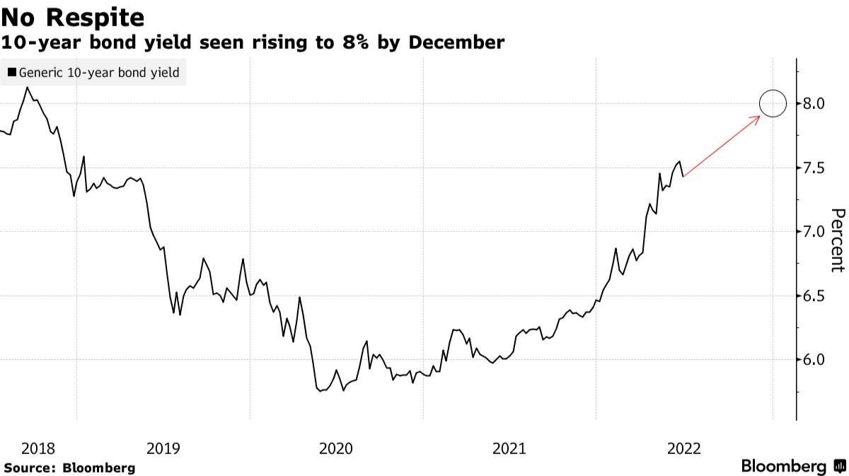 所有这些不利因素导致印度10年期国债收益率连续六个月下跌,花旗分析师预计该收益率可能会从目前的7.48%左右升至8%,而上一次达到8%还是在2018年。