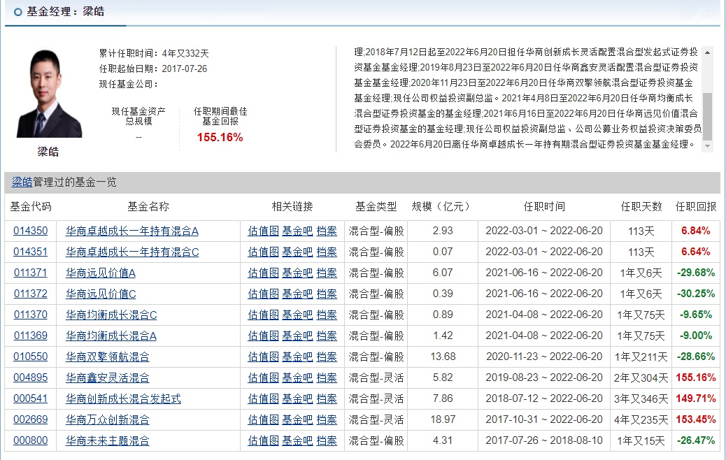 公开信息显示,梁皓于2012年5月加入华商基金,截至目前,梁皓在华商基金担任基金经理超过4年。数据显示,梁皓管理的上述7只基金,规模超过58亿元。