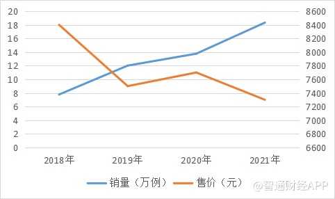 据历年招股书披露,公司产品的平均售价近年来有着明显降幅,已从2018年的8400元降低至2021年的7300元,四年间共降价14%;销量则从7.77万例逐渐增长至2021年的18.32万例。