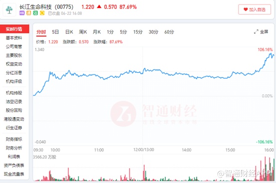 智通财经APP观察到,6月22日,长江生命科技早盘放量拉升,当日成交量已创下2020年2月13日以来新高。当日盘中,公司股价一度触及1.28港元,最高涨幅高达106.16%,最后收盘,成交额高达9.69亿港元。