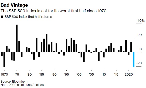 彭博汇编的数据显示,标准普尔500指数上一次在上半年度发生如此巨大跌幅的时期是在1970年。