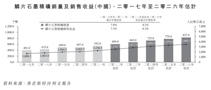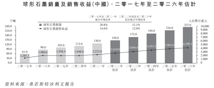 据弗若斯特沙利文预计,鳞片石墨精矿销售收入将于2026年达到34.65亿元人民币,2022-2026年的复合年增长率约为8.2%;球形石墨销售收入将由2022年的26.10亿元增至2026年的41.00亿元人民币,复合年增长率约为12.0%。