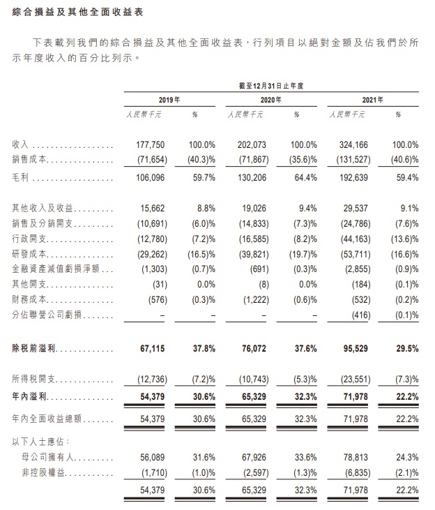 财务方面,公司在2019、2020、2021年度的收入分别为1.78亿元(人民币,下同)、2.02亿元、3.24亿元;年内溢利分别为5437.9万元、6532.9万元、7197.8万元。