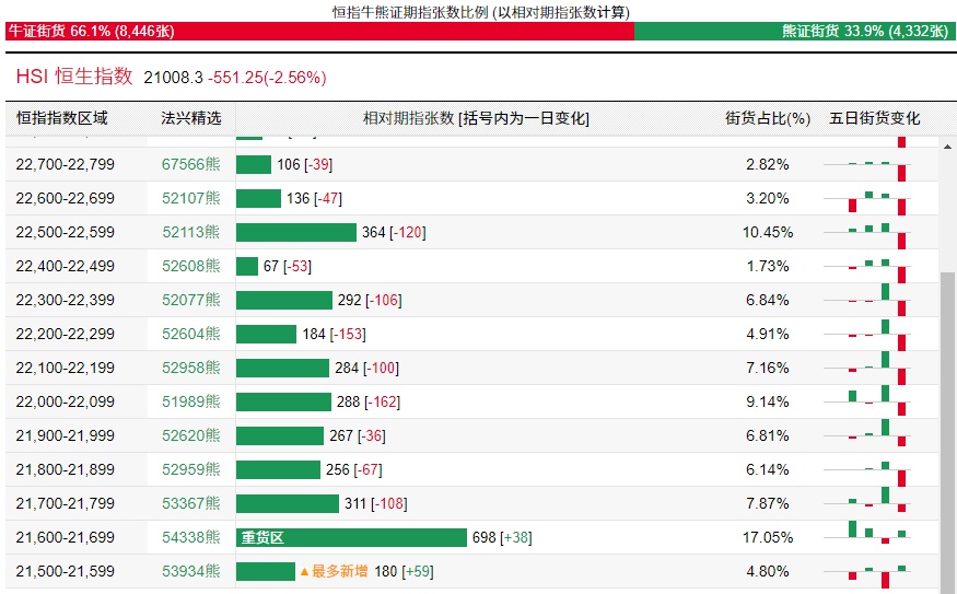 法兴恒指牛熊证街货分布图中的数据显示,熊证街货重货区在21600-21699区间,该区间最新熊证数量为698张,较上一交易日增加38张;最多新增在21500-21599区间,该区间最新熊证数量为180张,较上一交易日增加59张。
