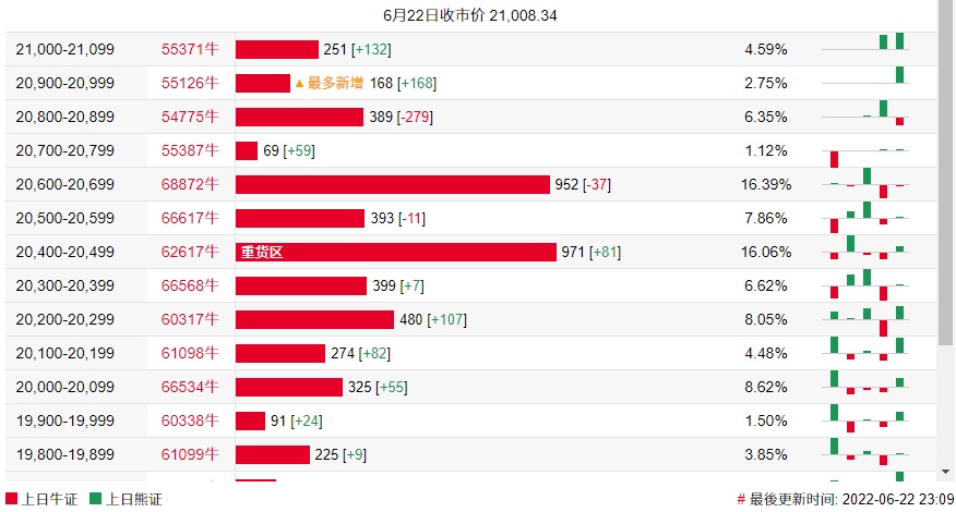 牛证街货重货区在20400-20499区间,该区间最新牛证数量为971张,较上一交易日增加81张;最多新增在20900-20999区间,该区间最新牛证数量为168张,较上一交易日增加168张。