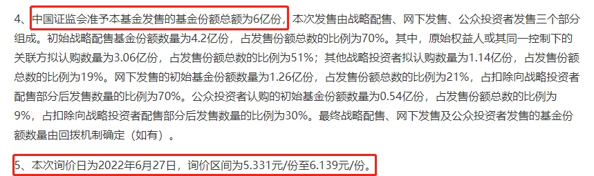 证监会公告指出,本次询价日为2022年6月27日,询价区间为5.331元/份至6.139元/份,并将通过网下询价确定基金认购价格。