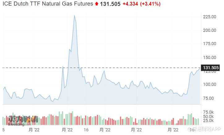截至发稿,欧洲基准TTF荷兰天然气期货涨3.41%,报131.505欧元/兆瓦时。