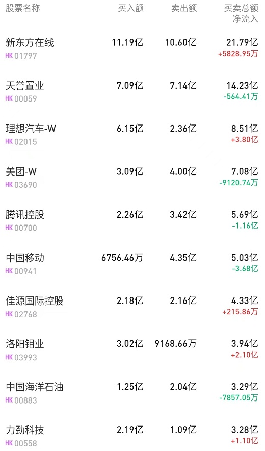 此外,中国海油(00883)、佳源国际控股(02768)分别获净买入6567万、215万港元。而中国移动(00941)、天誉置业(00059)分别遭净卖出3.67亿、564万港元。
