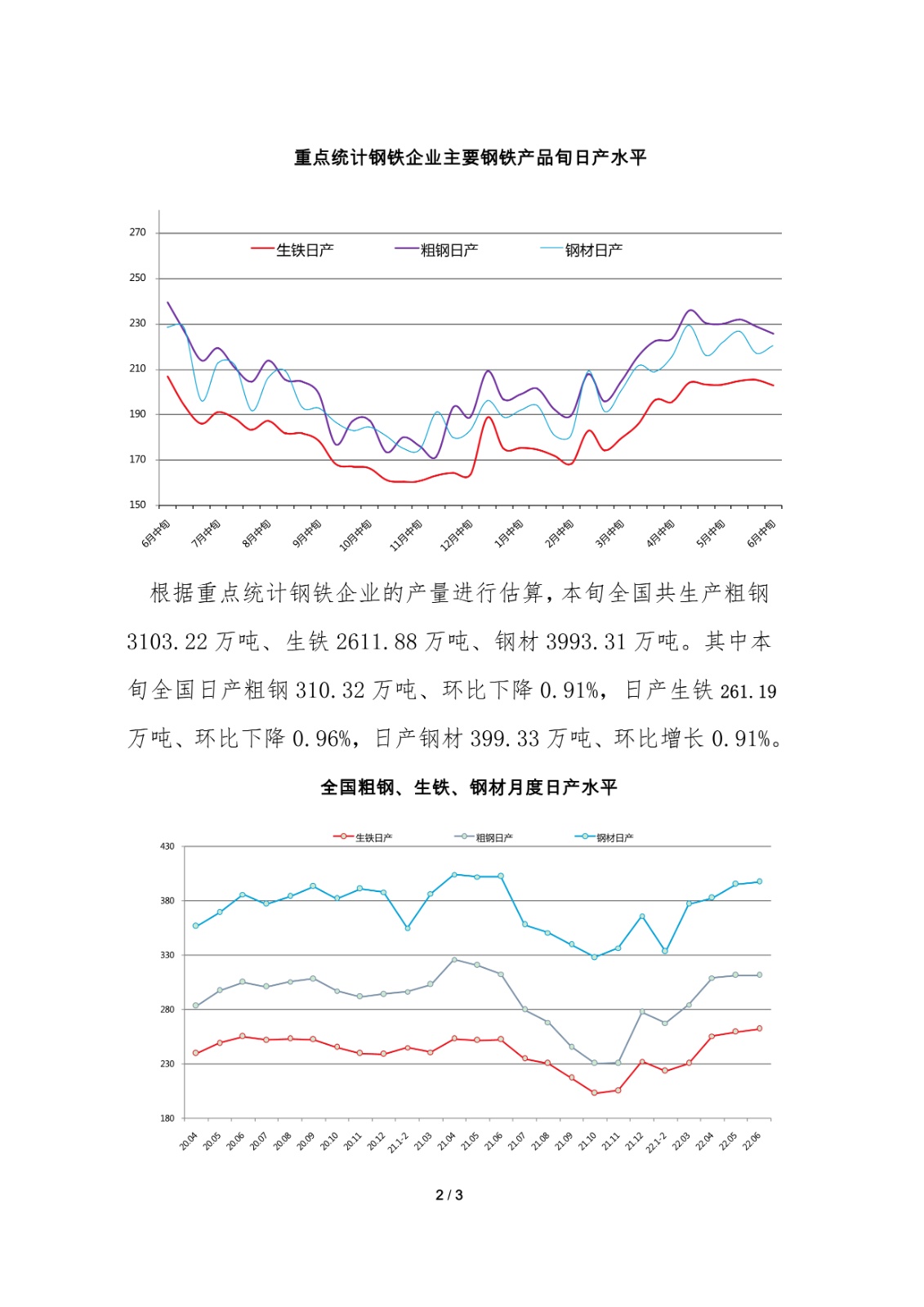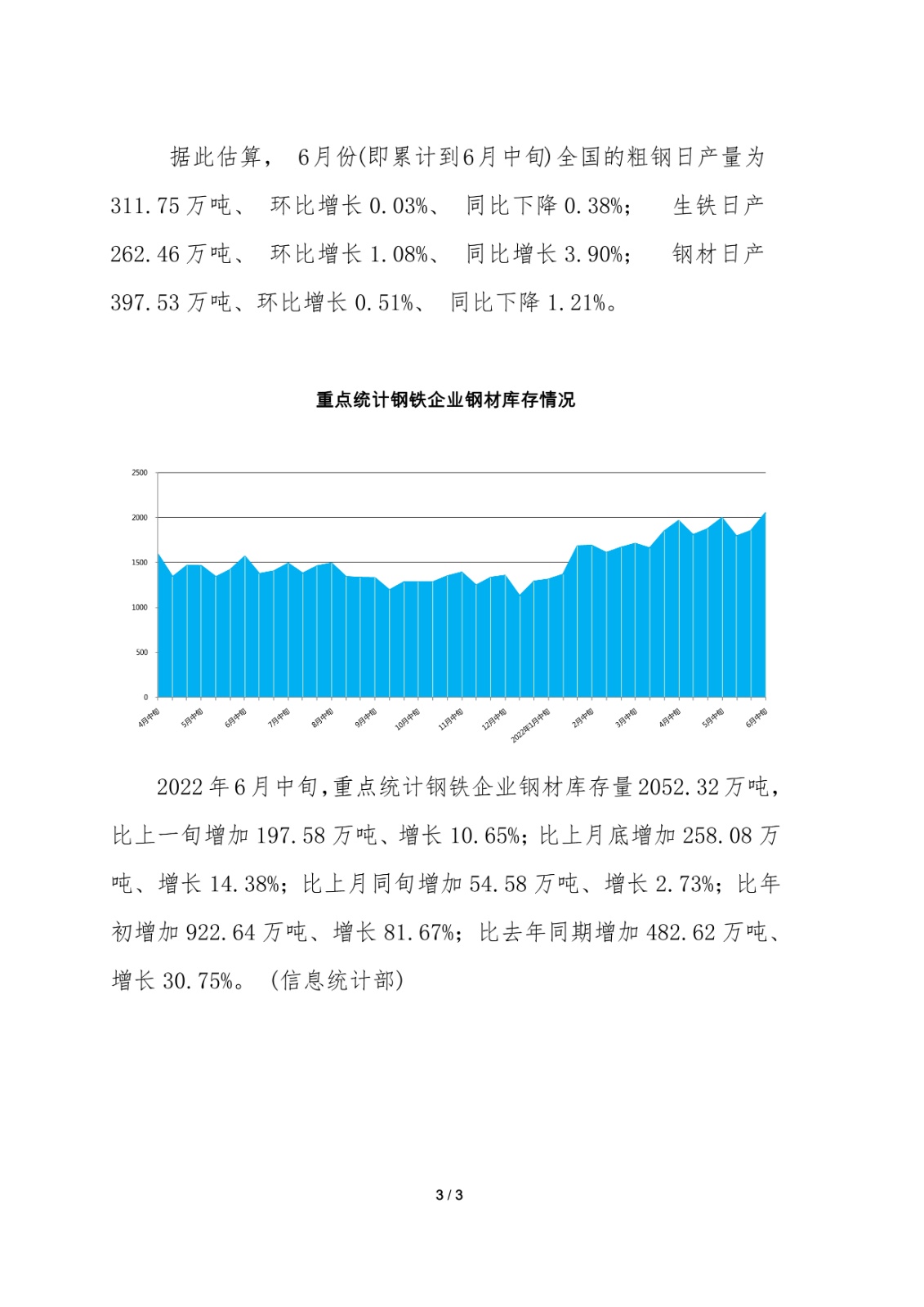 智通财经APP获悉,6月23日,中钢协公布2022年6月中旬重点统计钢铁企业产存情况。数据显示,2022年6月中旬,重点统计钢铁企业共生产粗钢2257.89万吨、生铁2029.25万吨、钢材2204.61万吨。其中,粗钢日产225.79万吨,环比下降1.34%;生铁日产202.92万吨,环比下降1.12%;钢材日产220.46万吨,环比增长1.50%。