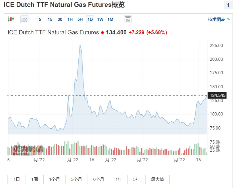 受该消息影响,欧洲天然气价格应声上涨。截至发稿,欧洲基准TTF荷兰天然气期货涨5.68%,报134.40欧元/兆瓦时。自北溪一号天然气输送量被削减之后,TTF荷兰天然气期货价格已经上涨了近50%。