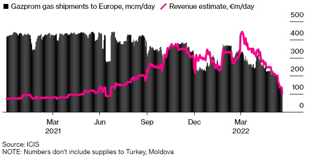 ICIS天然气分析主管Tom Marzec-Manser表示:“令人震惊的是,尽管俄气对欧洲的每日供气量减少了75%,但每日收入仍与一年前持平,并且肯定高于疫情前的水平。”他表示,俄罗斯近几个月以来的天然气收入“高得令人咋舌”,自俄乌冲突爆发以来累计约350亿欧元。
