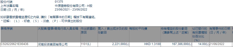 智通财经APP获悉,香港联交所最新资料显示,6月21日,河南投资集团增持中州证券(01375)222.1万股,每股作价1.31港元,总金额约为290.95万港元。增持后最新持股数目约为1.67亿股,最新持股比例为14.00%。