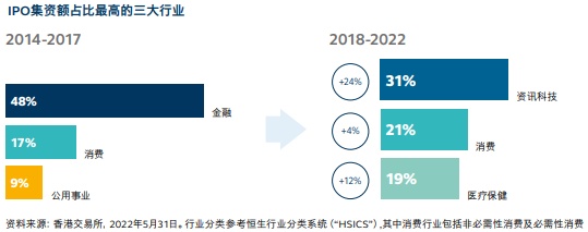 2018年的上市制度改革正在持续为香港资本市场的发展发挥作用,不断吸引更多不同领域的发行人来港上市,为我们的市场增添了新的活力。香港新股集资额前三名的行业由过往的金融及公用事业等较传统行业,转变为资讯科技、消费及医疗保健行业,分别在2018年至2022年占31%、21%和19%。