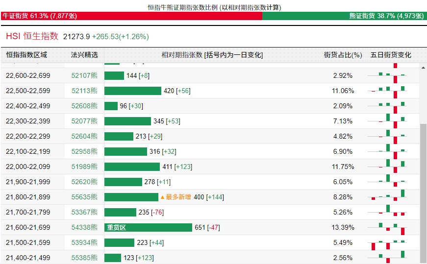法兴恒指牛熊证街货分布图中的数据显示,熊证街货重货区在21600-21699区间,该区间最新熊证数量为651张,较上一交易日减少47张;最多新增在21800-21899区间,该区间最新熊证数量为400张,较上一交易日增加144张。
