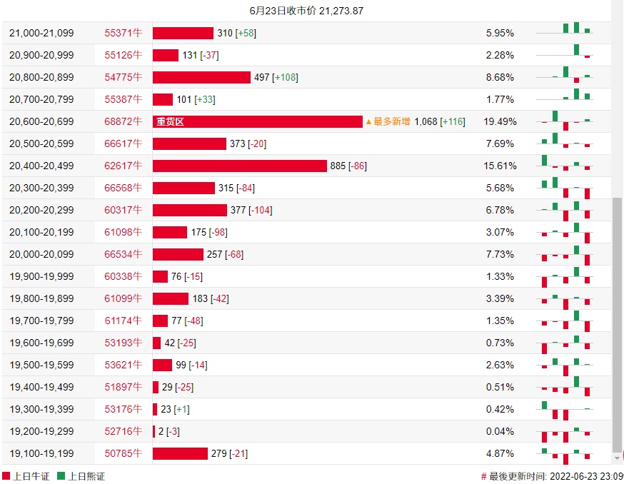 牛证街货重货区在20600-20699区间,该区间最新牛证数量为1068张,较上一交易日增加116张;最多新增在同一区间。