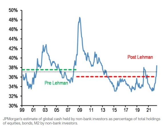 Panigirtzoglou估计,投资者持有的现金水平接近40%,是10年来的最高水平。Panigirtzoglou追踪的是一个基于美联储和商业银行以外的股票、债券和现金持有量的指标。