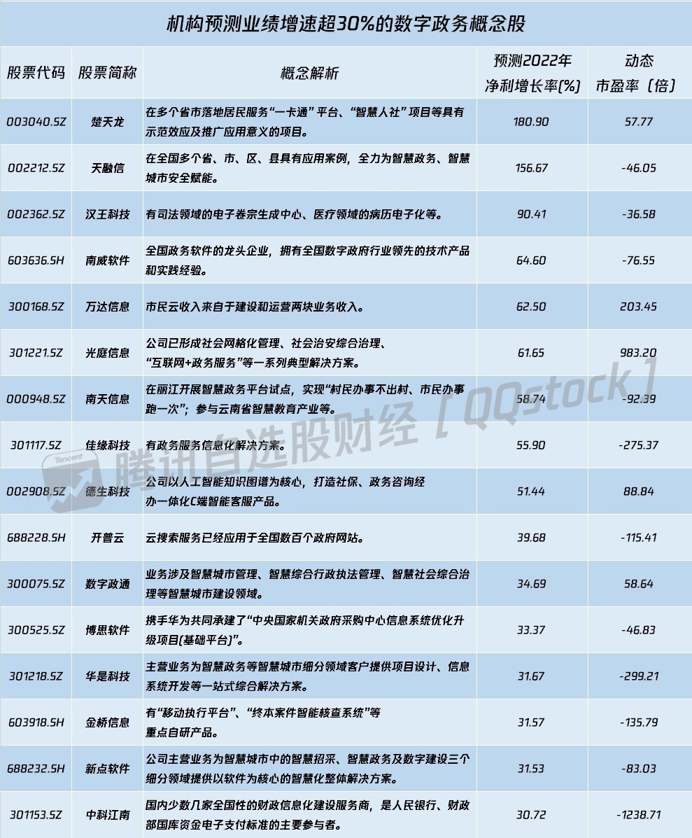 点评:国元证券预计,2025年政务信息化市场规模将达到5200亿元。自选哥梳理2022年机构预测增长的数字政务概念股发现,其中16股机构预测净利增幅超30%,其中楚天龙、天融信等机构预测净利增幅超100%。