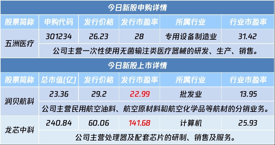 自选哥提示,今日五洲医疗迎来申购,润贝航科、龙芯中科两只新股上市。