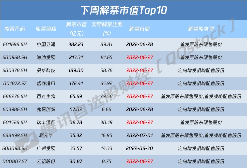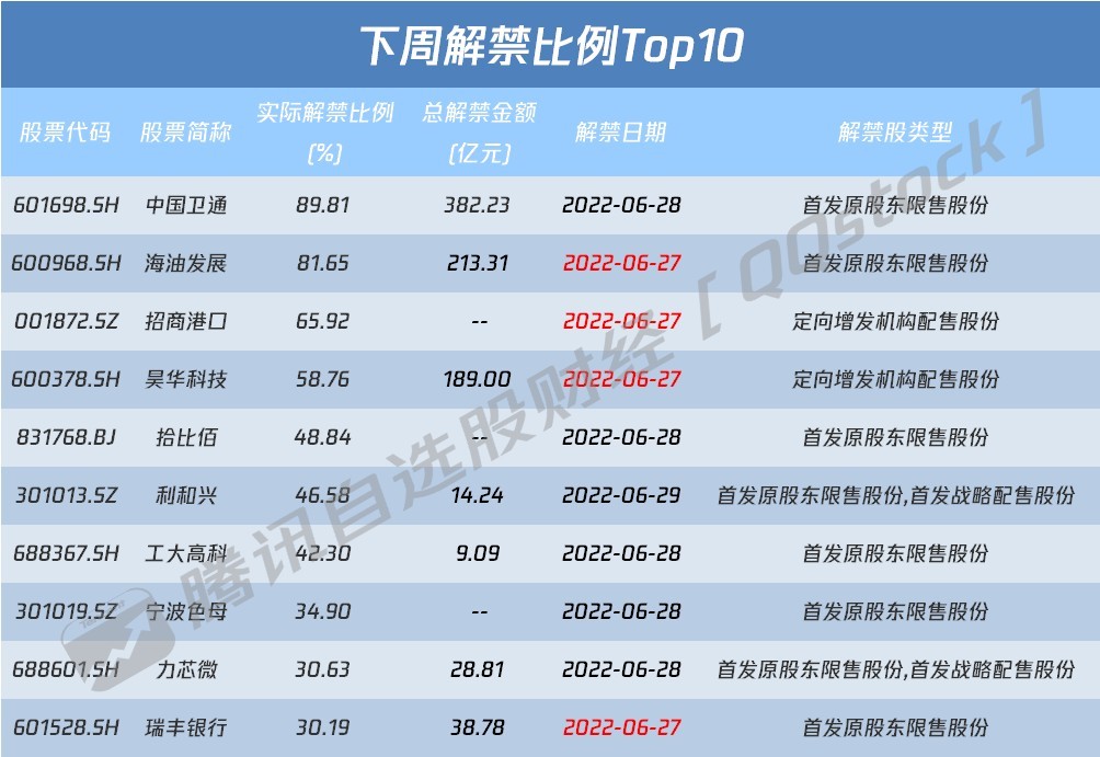 从解禁比例来看,未来五日,中国卫通解禁比例达89.81%,其次解禁比例居前的分别为海油发展和招商港口;从解禁市值来看,中国卫通、海油发展、昊华科技等股解禁市值居前。