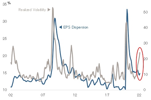 Palfrey表示,如果离散度变松散,美国企业的盈利情况可能会恶化。历史表明,股票波动率和离差指标往往相比分析师降级更早出现征兆。