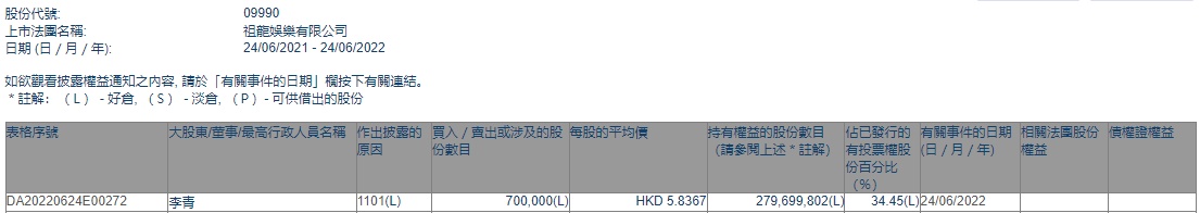 智通财经APP获悉,香港联交所最新资料显示,6月24日,执行董事兼CEO李青增持祖龙娱乐(09990)70万股,每股作价5.8367港元,总金额约为408.57万港元。增持后最新持股数目约为2.80亿股,最新持股比例为34.45%。