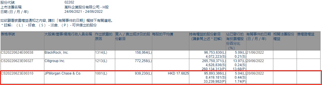 智通财经APP获悉,香港联交所最新资料显示,6月20日,小摩增持万科企业(02202)93.923万股,每股作价17.6825港元,总金额约为1660.79万港元。增持后最新持股数目约为9589.34万股,最新持股比例为5.04%。