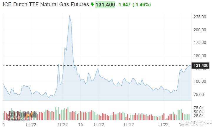 截至发稿,欧洲基准TTF荷兰天然气期货跌1.46%,报131.40欧元/兆瓦时。不过,该期货本周累计涨超11%,上一周则上涨超40%。